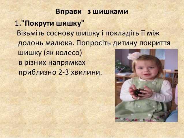 шишку" Візьміть соснову шишку і покладіть її між долонь малюка. Попросіть